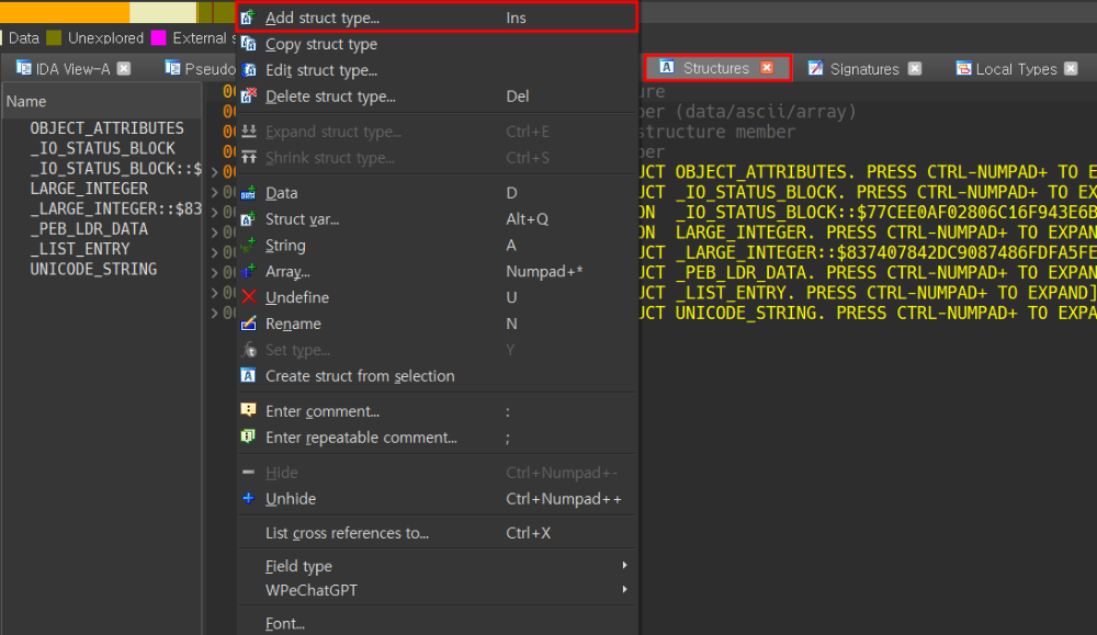 Views → Open subviews → Structres(Shift + F9)에서 우클릭 후, Add struct type...(Ins)클릭