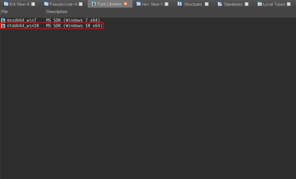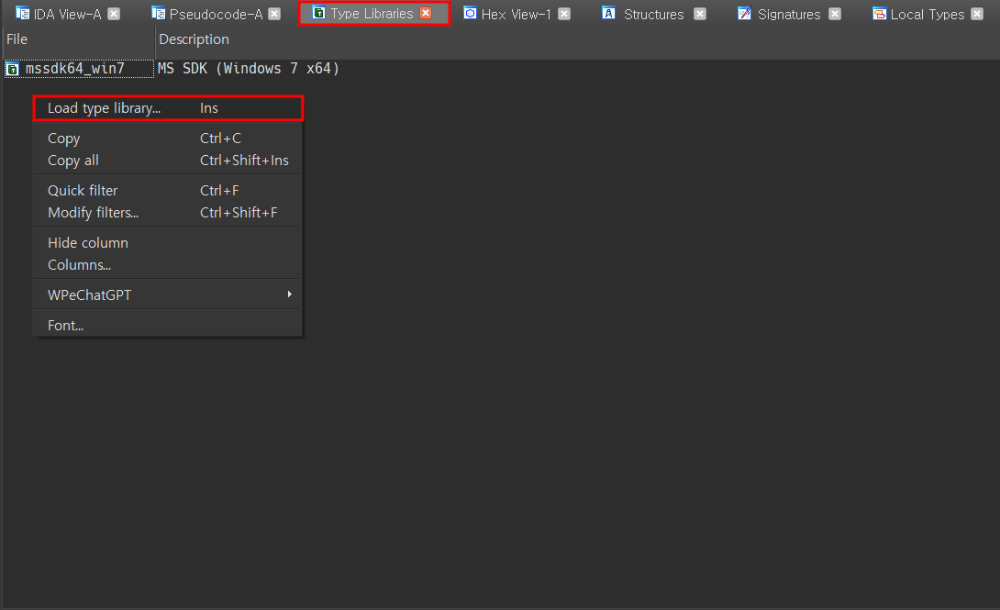 Views → Open subviews → Type Libraries(Shift + F11)에서 우클릭 후, Load type library...(Ins)클릭