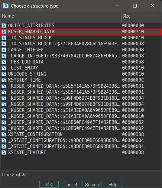 Choose a structure type에서 KUSER_SHARED_DATA 클릭