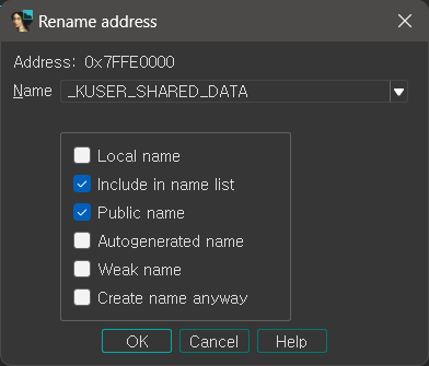 다만, 이미 세그먼트의 이름을 KUSER_SHARED_DATA으로 생성했기에, 중복된 이름으로 설정이 불가능하여 언더바를 추가하였다.