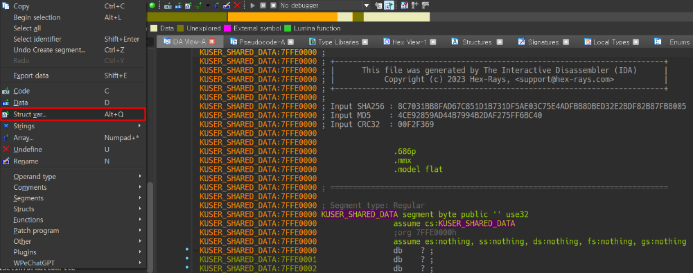 생성한 KUSER_SHARED_DATA 세그먼트의 시작 주소인 0x7FFE0000으로 이동 후, Edit → Struct var...(Alt + Q) 클릭